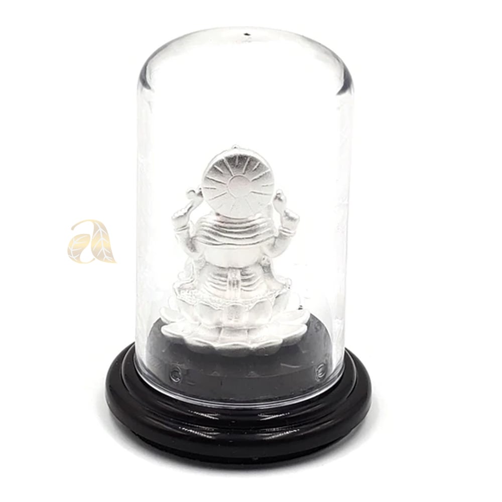 999 Pure Silver LORD GANESHA Silver idol is made of 99.9% pure silver and comes with cherry colored round wood stand and hard acrylic removable cover. Reference Idols were first crafted in clay by Skilled and Reputed Sculptors and then converted into Silver Form, conforms to Vastu and Indian religious traditions. Made with Excellent Silver hardness and superior quality.