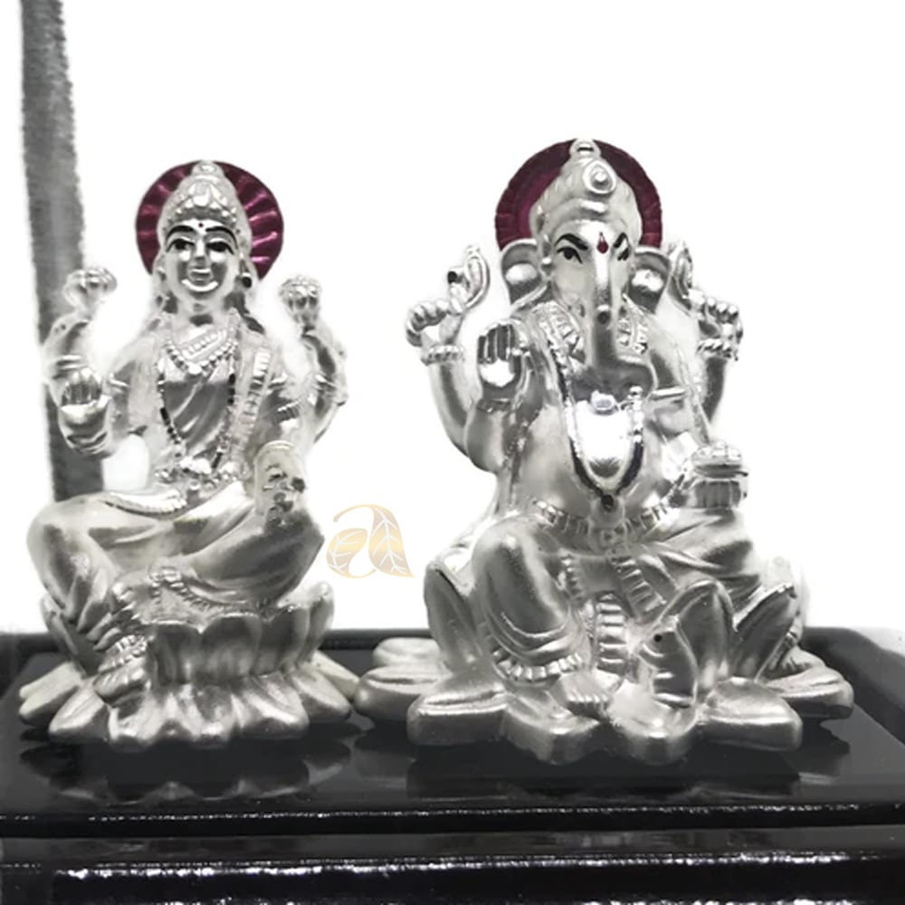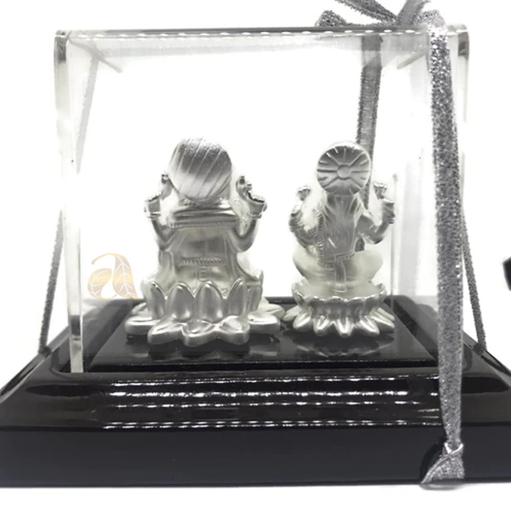 999 Pure Silver LORD GANESHA & GODDESS LAKSHMI / LAXMI SILVER IDOL Silver idol is made of 99.9% pure silver and comes with cherry colored Rectangular wood stand and hard acrylic Removable Rectangular cover. Reference Idols were first crafted in clay by Skilled and Reputed Sculptors and then converted into Silver Form, conforms to Vastu and Indian religious traditions. Made with Excellent Silver hardness and superior quality.