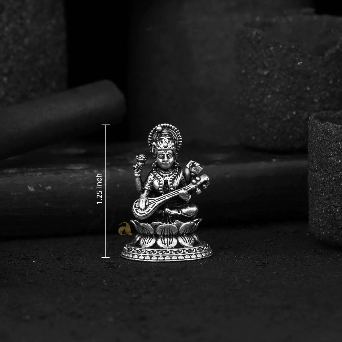 This idol was made from 92.5 silver sits on a Lotus that serves to hold it and highlight its beauty, Saraswati, goddess of knowledge and the arts, embodies the wisdom of Devi. She is the river of consciousness that enlivens creation; she is the dawn-goddess whose rays dispel the darkness of ignorance.